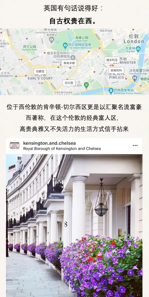 肯辛顿-切尔西区是英国著名的皇家自治区之一,位于伦敦西区,靠近泰晤士河。自英国建立以来,肯辛顿一直是上层阶级的领域,众多英国皇室成员居住的肯辛顿宫就坐落于此。