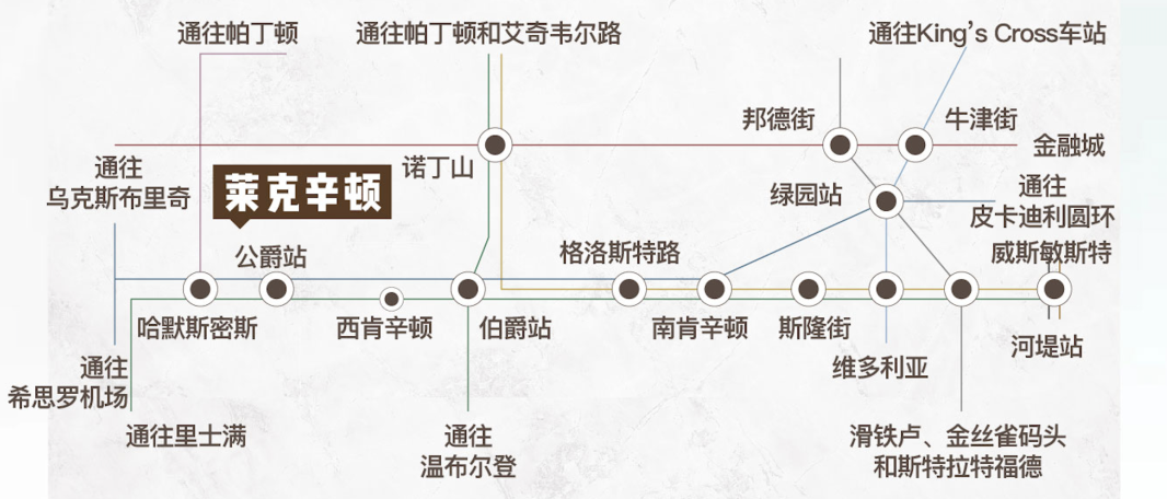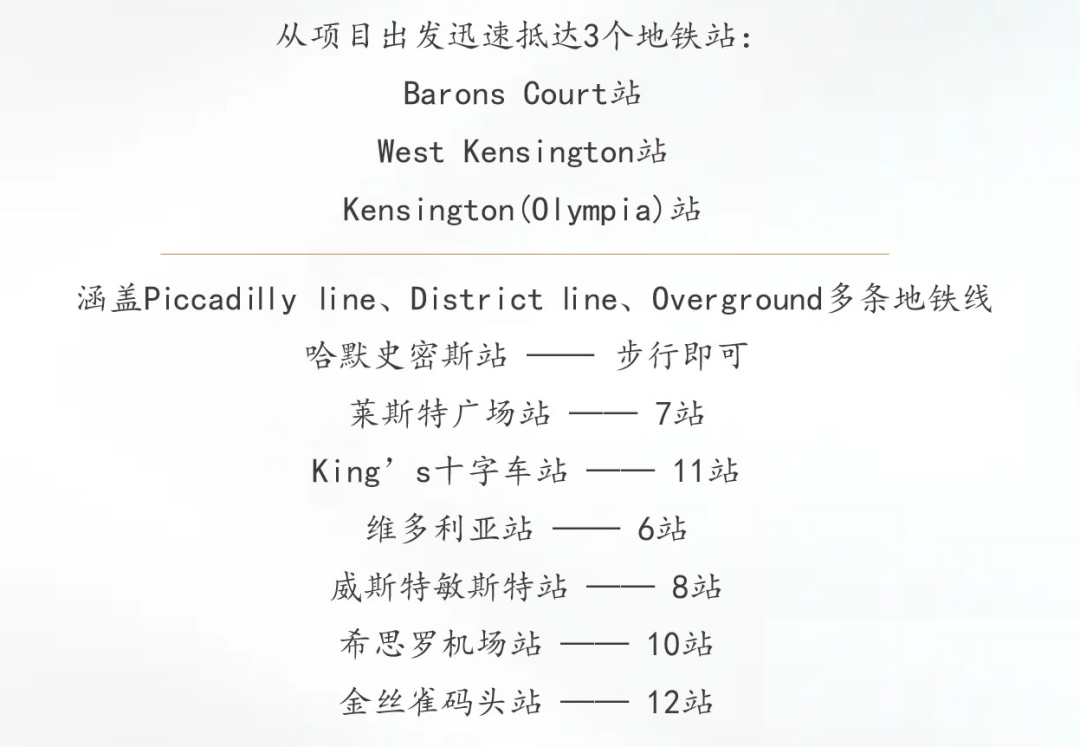 Lexington House靠近西肯辛顿和公爵宫站,可乘坐区域线(District Line)和皮卡迪利线(Piccadilly Line),通往市中心。从项目出发,搭乘地铁2站即可到达南肯辛顿站点,搭乘皮卡迪利蓝线7站可直达中国城。